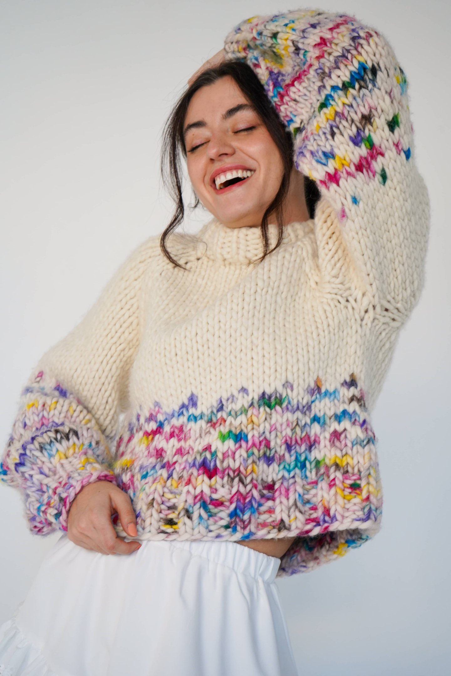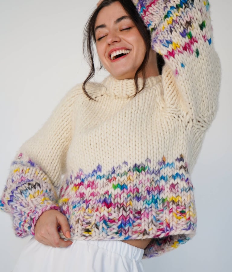 "The Rainbow Sweater kit by @paula.on.knits is an intermediate level project. This chunky knit results in a very textured and unique sweater. The combination of colors makes it an original piece with a unique personality."