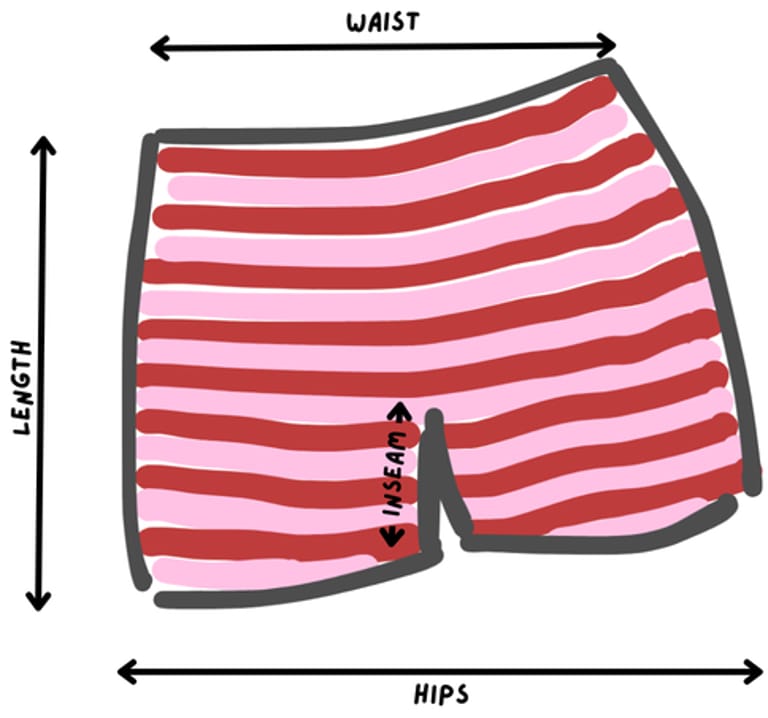 Sizes S M L | Length (cm/inch) 28 / 11 29 / 11.4 30 / 11.8 | Hips (cm/inch) 44 / 17.3 46 / 18.1 50 / 19.7 | Waist (cm/inch)** 34 / 13.4 36 / 14.2 38 / 15 | Inseam (cm/inch) 4 / 1.5 4 / 1.5 4 / 1.5 |